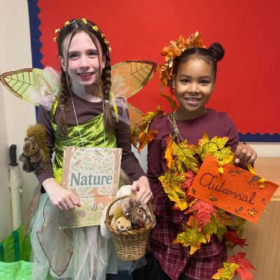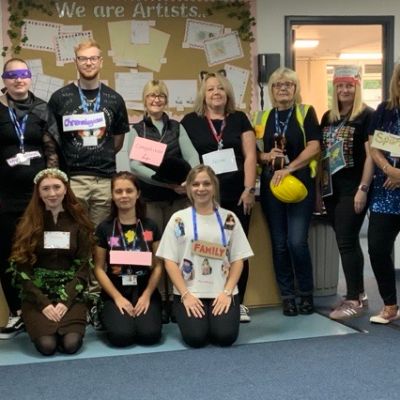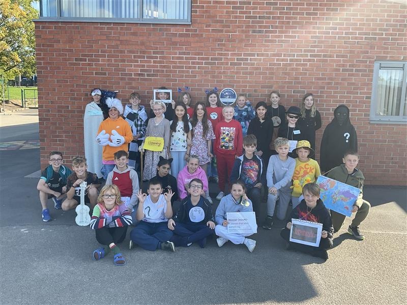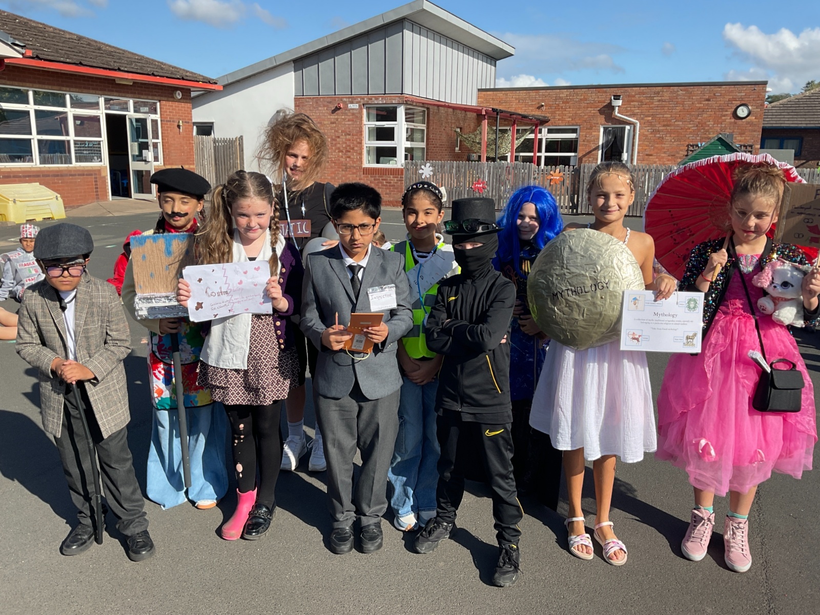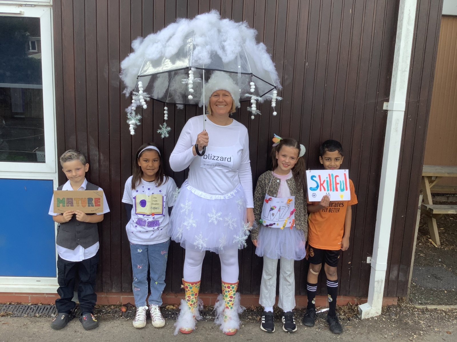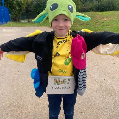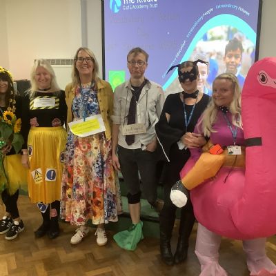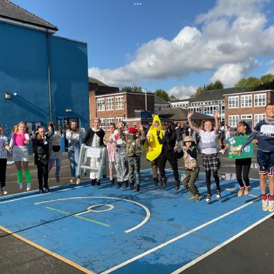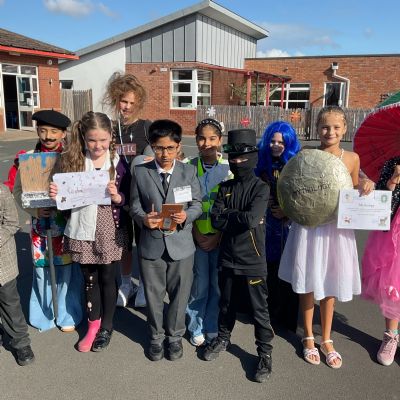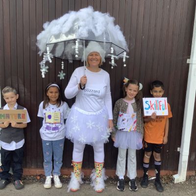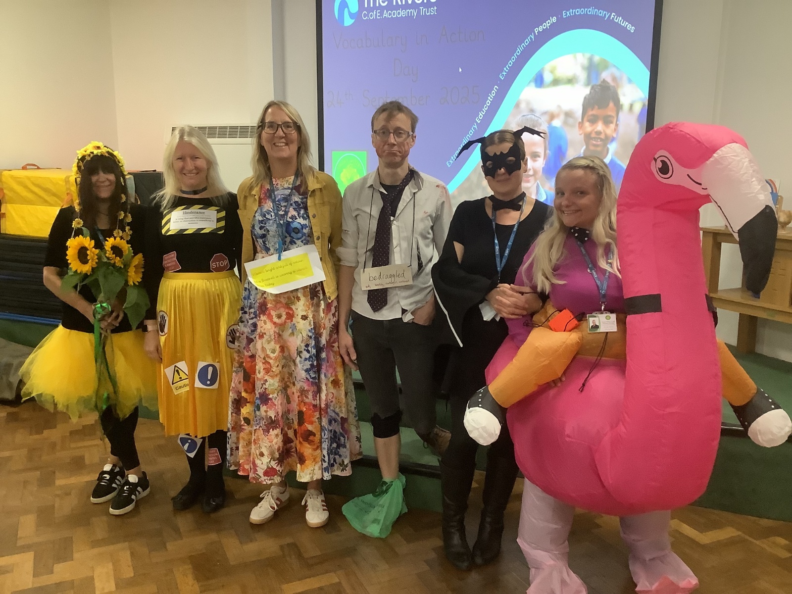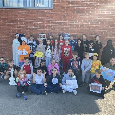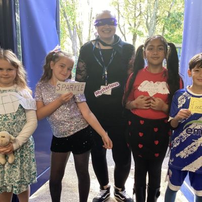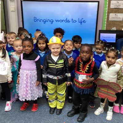 Pupils and staff dressed as words like metamorphosis and courageous, taking part in creative activities to explore language and spark conversations.